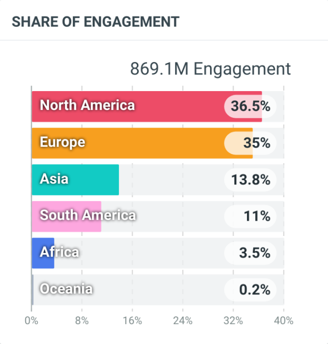 From a total of (266 Million) engagements, 46.4% of the engagement came from Europe, followed by North America (36.2%). Only 5.6% of the engagement came from South America, and 9.1% was from Asia