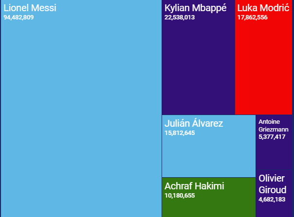 Fans Seemed to be extra interested in Messi among other players during the finals attaining to 162 million engagements after leading his team to the title. Following Messi was Kylian Mbappe with 59 million engagements. Two other Argentinian players and one other French player were among the top engaged players, leaving only Luka Modric as the only player with high engagement that didn’t play in the finals.